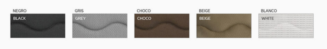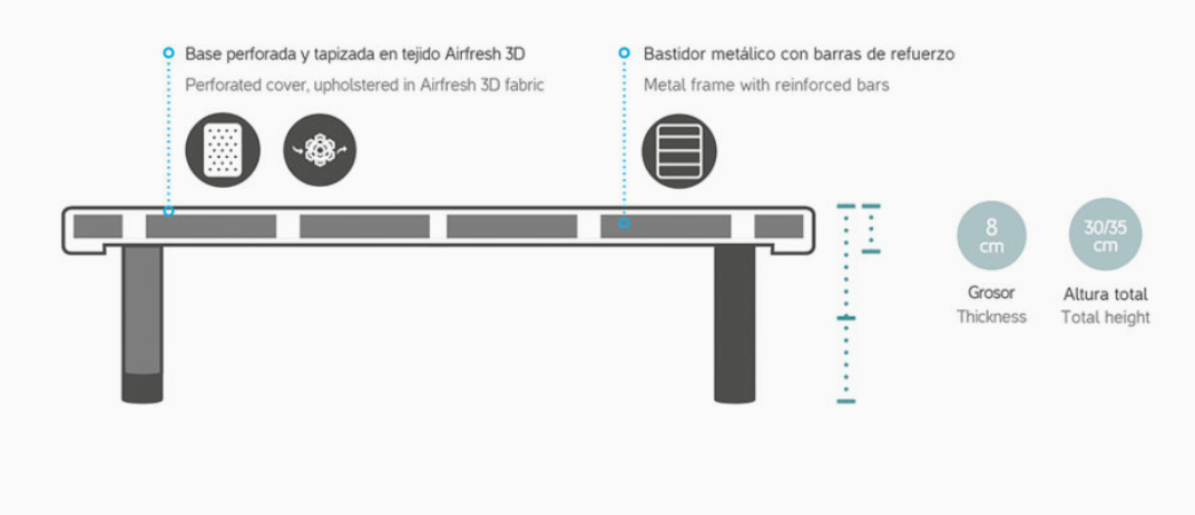 Base tapizada en malla transpirable 3D disponible en los colores negro, gris, choco, beige y blanco con bastidor de 40x30 y barras de refuerzo que le dan una altura de 8 cms y perforada para una mayor transpiración para cualquier tipo de colchón