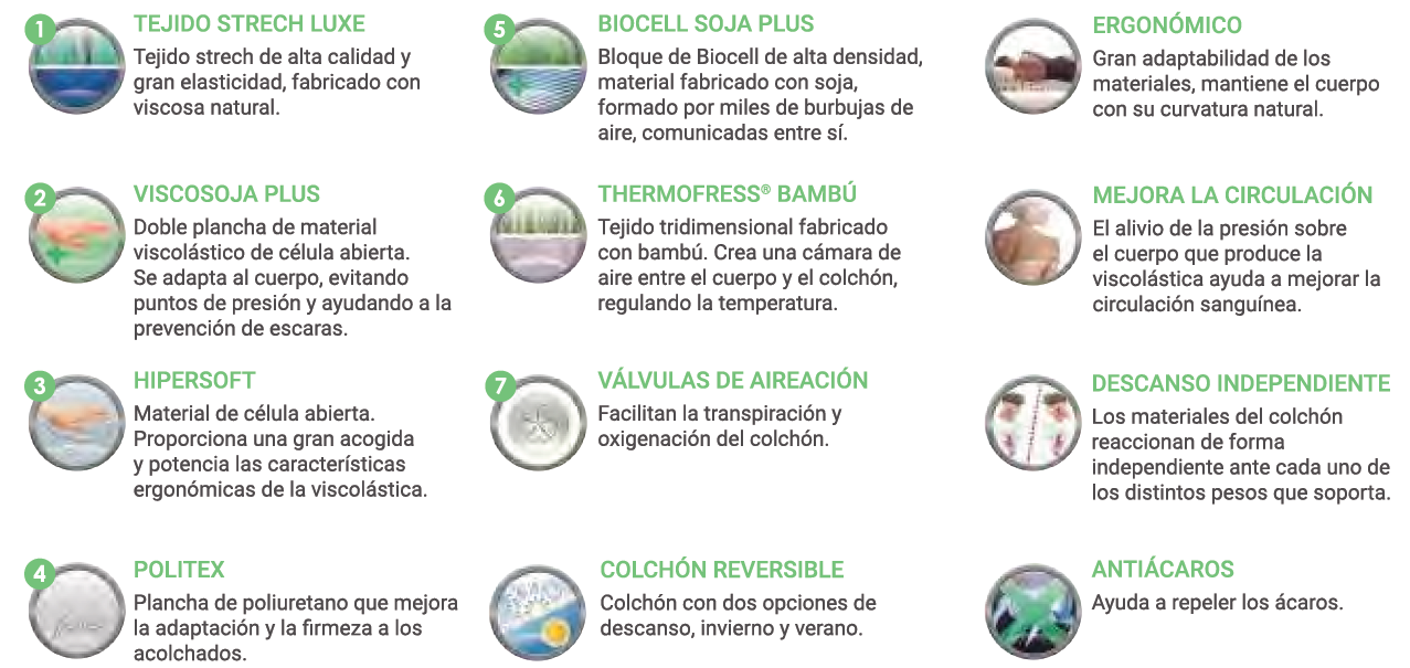 Colchón natural fabricado con strech luxe, viscosoja plus, thermofress bambú y biocell soja plus de alta calidad para aquellos que les gusta descansar en un colchón con materiales de la más alta calidad.