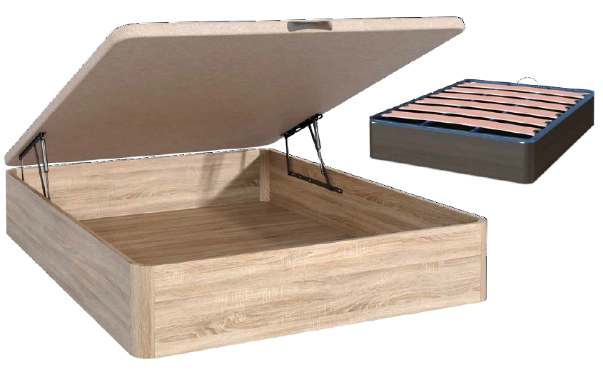 Canapé de madera al suelo con 4 patas. Altura exterior de 32 cms, capacidad interior 29 cms y tapa en tejido 3D para una buena transpiración. Costados de 22 mm de grueso con posibilidad de sistema movil.