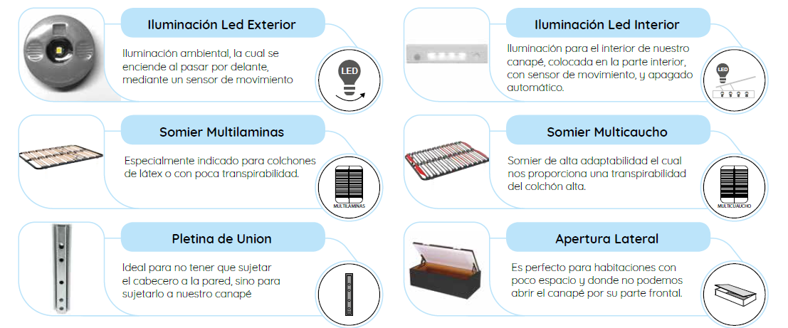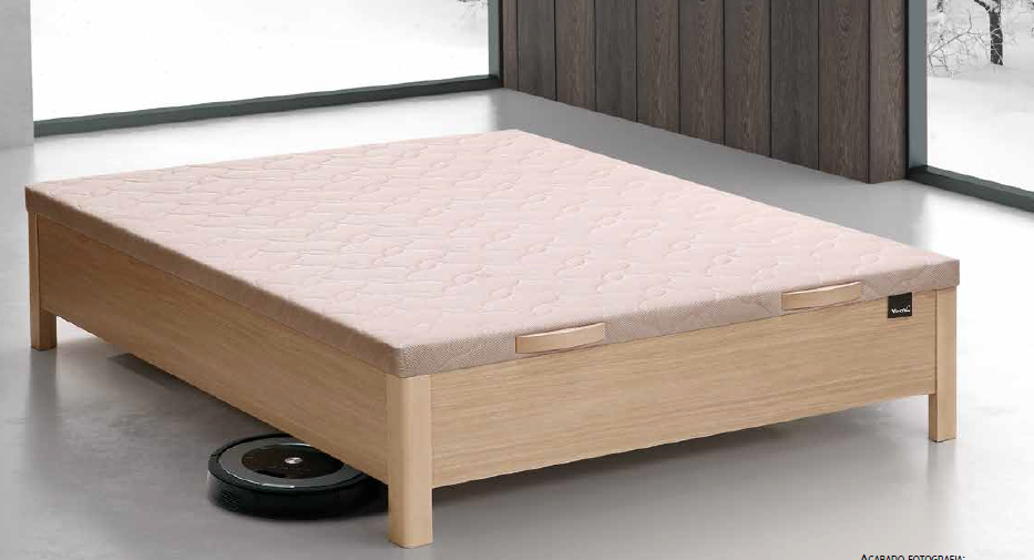 Canapé de madera con patas en madera maciza 7x7, altura exterior de 42 cms, perfecta para aspirador autónomo y capacidad interior de 22 cms. Tapa en tejido 3D y costado en 25 mm.