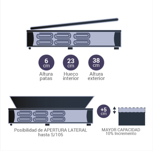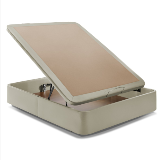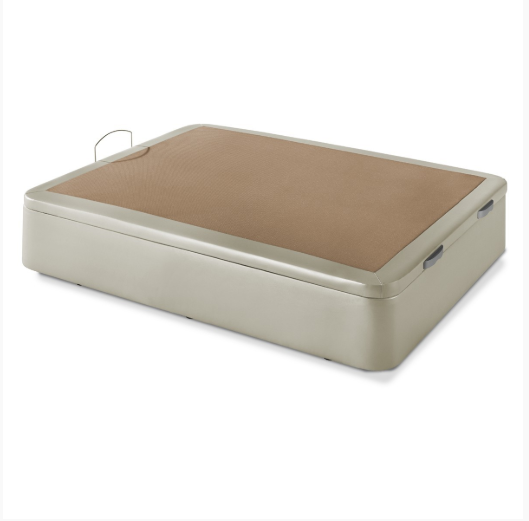Las bases de gran tamaño, a partir de 160 cm, están formadas por dos canapés gemelos con tapas independientes y esquinas rectas en la zona de unión. Las medidas de 135, 140 y 150 cms de ancho se fabrican con la tapa entera y el arcón dividido horizontalmente en dos piezas.