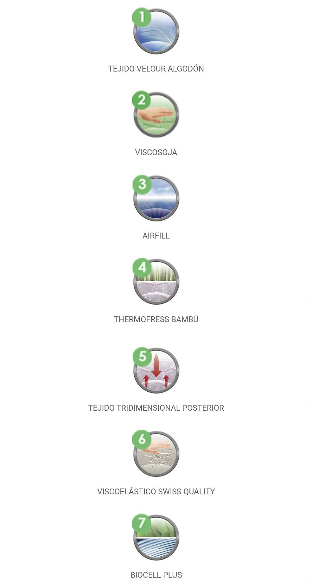 Thermofress Bambú: Tejido tridimensional fabricado con bambú. Crea una cámara de aire entre el cuerpo y el Colchón, regulando la temperatura corporal.